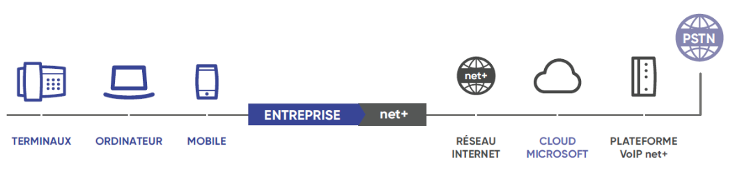 Outil collaboratif, Teams devient votre central téléphonique. Ainsi, vos collaborateurs communiquent avec plus d’efficacité et travaillent ensemble plus aisément à l’aide des applications Microsoft 365 intégrées. Le service Teams s’intègre facilement dans votre téléphonie d’entreprise SIP Trunk.